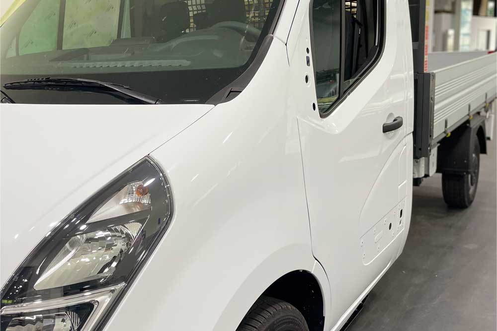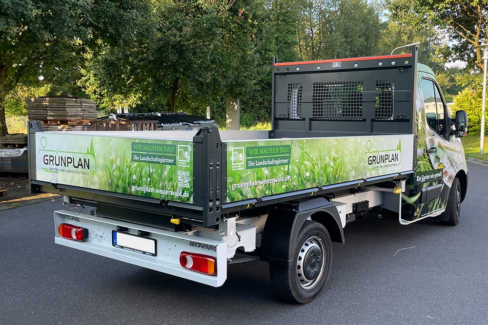 Kfz-Beklebung am Anfang Transporter mit Pritsche Kfz-Beklebung – Die ersten Drucke werden angebracht Kfz-Beklebung – Maßarbeit ist gefragt. Kfz-Beklebung – fertig gestellt von vorne rechts Kfz-Beklebung – fertig gestellt von hinten rechts<